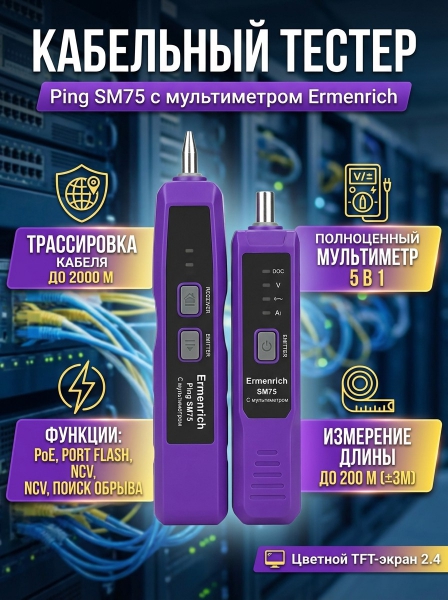 Кабельный тестер с мультиметром Ermenrich Ping SM75 - ОписаниеКабельный тестер с мультиметром Ermenrich Ping SM75 предназначен для использования специалистами, занимающимися монтажом, диагностикой и обслуживанием компьютерных сетей и телефонных линий. Функции мультиметра пригодятся при работе с электрооборудованием и электрическими кабелями.