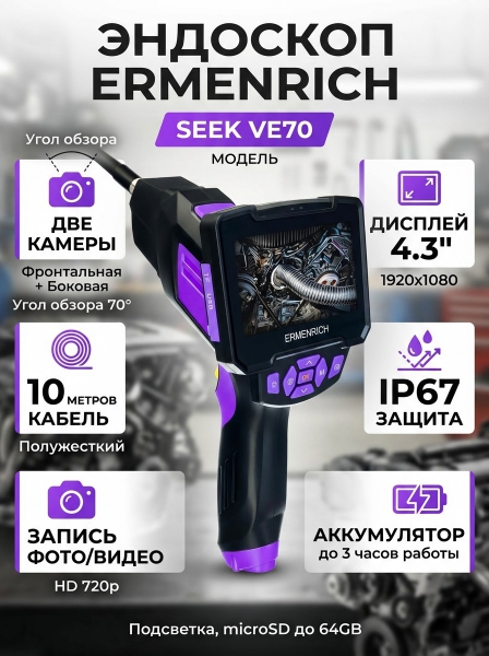 Видеоэндоскоп Ermenrich Seek VE70, фиолетовый - БрендСтрана бренда: Германия Премиальность бренда:Видеоэндоскоп Ermenrich Seek VE70, фиолетовый - Характеристики