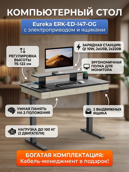 Компьютерный стол с электроприводом и ящиками Eureka ERK-ED-I47-WN - БрендСтрана бренда: КНР Премиальность бренда:Компьютерный стол с электроприводом и ящиками Eureka ERK-ED-I47-WN - Характеристики