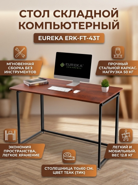 Складной стол для компьютера Eureka ERK-FT-43T Teak - ОписаниеСомневаетесь? - Посмотрите рейтинг ТОП-10 по категории «Геймерские столы»Складной письменный стол (для компьютера) EUREKA ERK-FT-43T - это идеальное решение для небольшого офиса или квартиры. Собирается и разбирается за считанные секунды, удобно переносить. Можно сложить в углу, чтобы сэкономить место. Столешница выполнена из МДФ.