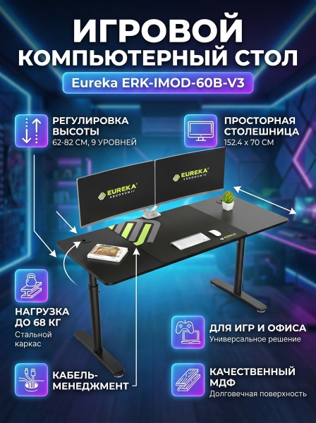 Компьютерный стол Eureka ERK-IMOD-60B - ОписаниеСомневаетесь? - Посмотрите рейтинг ТОП-10 по категории «Геймерские столы»Стол для компьютера EUREKA ERK-IMOD-60B - это идеальное решение для офиса или квартиры. Обеспечивает достаточно места для монитора и компьютера. Предлагает 9 вариантов высоты, подходит для людей разного роста. Отверстия для проводов помогает сохранить рабочее пространство чистым и свободным от беспорядка.