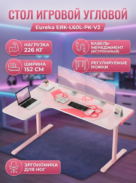 Стол письменный (для компьютера) угловой Eureka ERK-L60L-PK-V2 (левый) - ОписаниеБольшая игровая поверхность: игровые столы EUREKA L60 с большой площадью поверхности предлагают достаточно места для размещения двух или более мониторов, игровой клавиатуры и других игровых аксессуаров, требующих дополнительного места. Этот розовый Г-образный стол тщательно продуман для эффективного использования угловых пространств, обеспечивая как просторную рабочую поверхность, так и достаточно места в ногах для отдыха и хранения вещей.