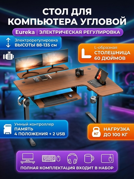 Стол для компьютера угловой c электрической регулировкой Eureka ERK-L60R-WN - БрендСтрана бренда: КНР Премиальность бренда:Стол для компьютера угловой c электрической регулировкой Eureka ERK-L60R-WN - Характеристики