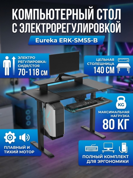 Стол для для компьютера c электрической регулировкой Eureka ERK-SM55-B - ОписаниеСтол для компьютера EUREKA ERK-SM47-B - это идеальное решение для офиса или квартиры. Обеспечивает достаточно места для монитора и компьютера. Предлагает 5 вариантов высоты, подходит для людей разного роста. Отверстия для проводов помогают сохранить рабочее пространство чистым и свободным от беспорядка.