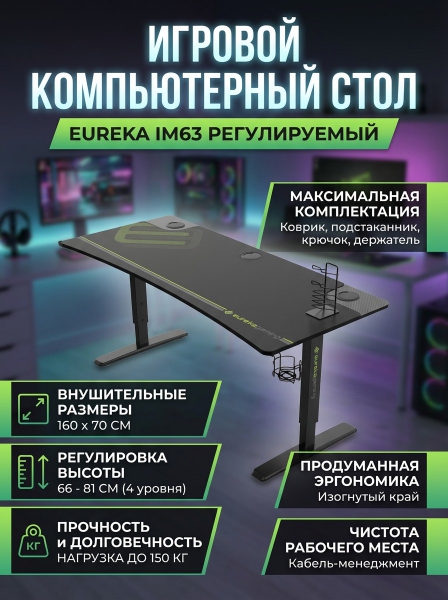 Стол для геймеров с регулировкой по высоте Eureka IM63 Black - ОписаниеСтол для компьютера (для геймеров) EUREKA IM63 - это идеальное решение для офиса или квартиры. Обеспечивает достаточно места для монитора и компьютера. Предлагает ручную регулировку высоты (4 уровня регулировки), подходит для людей разного роста. Отверстия для проводов помогают сохранить рабочее пространство чистым и свободным от беспорядка.