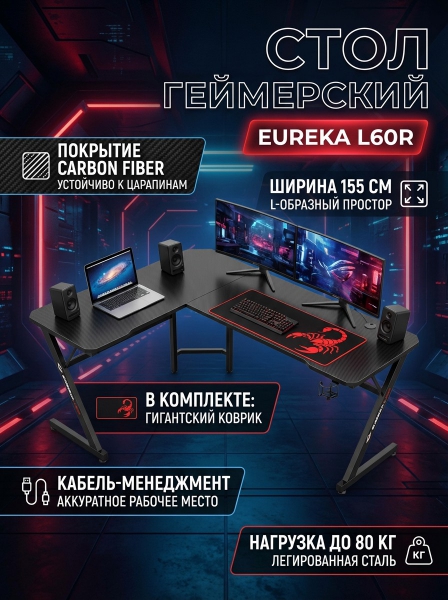 Стол для геймеров Eureka L60R - ОписаниеСомневаетесь? - Посмотрите рейтинг ТОП-10 по категории «Геймерские столы»Стол для геймеров Eureka L60 Gaming Desk - идеальный выбор тех, у кого много игровых девайсов. L60 имеет 60-дюймовую столешницу с гладким покрытием в стиле карбон. На столе для геймеров Eureka L60 можно с лёгкостью разместить несколько мониторов, игровую консоль, клавиатуру и много другого оборудования. А благодаря специальной системе управления кабелями, на вашем столе никогда не будет лишних проводов.