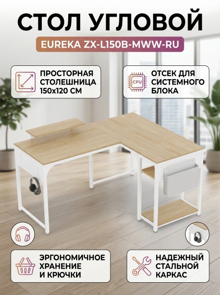 Стол письменный угловой Eureka ZX-L150B-MWW-RU, Maple White - ОписаниеСомневаетесь? - Посмотрите рейтинг ТОП-10 по категории «Геймерские столы»Стол письменный (для компьютера) угловой EUREKA ZX-L150B-B-RU с шириной 150 см - это идеальное решение для офиса или квартиры. Обеспечивает достаточно места для монитора и компьютера. Поставляется не только со специальным отсеком для системного блока, но и оснащен досками с несколькими крючками с двух сторон, чтобы держать все важные вещи под рукой.