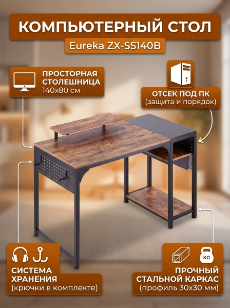 Стол компьютерный Eureka ZX-SS140B - ОписаниеСтол для компьютера EUREKA ZX-SS140B - это идеальное решение для офиса или квартиры. Обеспечивает достаточно места для монитора и компьютера. Поставляется не только со специальным отсеком для системного блока, но и оснащен досками с несколькими крючками с двух сторон, чтобы держать все важные вещи под рукой.
