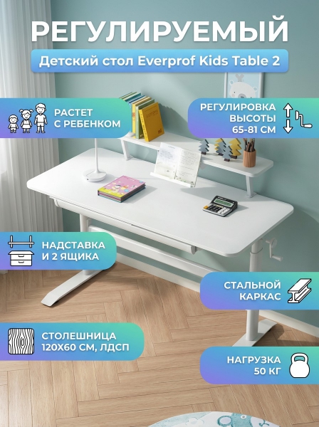 Основные преимущества стола Everprof Kids Table 2: - Белый цвет: Гарантирует легкую адаптацию к любому интерьеру комнаты. - Деревянная столешница: Качественный материал обеспечивает долговечность и экологичность изделия. - Стальные ножки с напылением: Гарантируют устойчивость стола и добавляют ему современный стиль. - Надставка и ящики: Предоставляют дополнительное место для хранения творческих принадлежностей и учебных материалов, помогая поддерживать порядок. - Регулировка высоты: Дает возможность “роста” стола вместе с вашим ребенком. - Габариты стола: С длиной в 1200 мм, шириной 600 мм и регулируемой высотой от 650 до 810 мм стол отвечает потребностям активного ребенка.