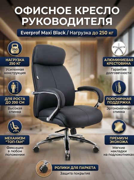 Премиум кресло Everprof Maxi экокожа - ОписаниеСомневаетесь? - Посмотрите рейтинг ТОП-10 по категории «Ортопедические кресла»Офисное кресло руководителя Everprof Maxi в обивке из высококачественной экокожи в черном цвете. Механизм качания с возможностью фиксации кресла в любом положении, который позволяет легко регулировать положение кресла, обеспечивая оптимальное положение во время работы.