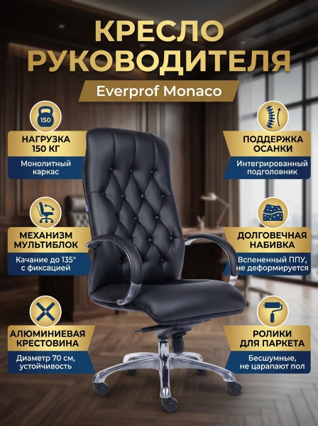Кресло руководителя Everprof Monaco - ОписаниеСомневаетесь? - Посмотрите рейтинг ТОП-10 по категории «Ортопедические кресла»Кресло для руководителя Monaco, экокожа черного цвета.