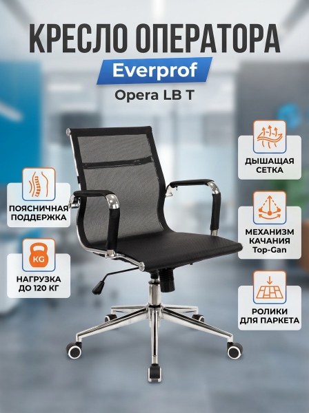 Кресло для оператора Everprof Opera LB T - ОписаниеСомневаетесь? - Посмотрите рейтинг ТОП-10 по категории «Ортопедические кресла»Операторское кресло Opera LB T, сетка черного цвета.
