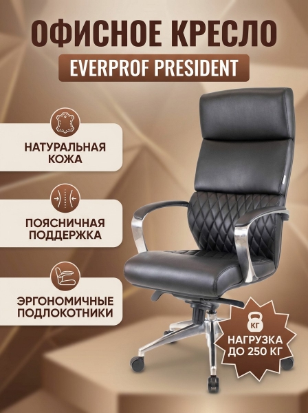 Everprof President – одно из немногих кресел, которое выдерживает нагрузку до 250 кг. Модель с монолитной спинкой и сиденьем эргономичной формы. Особая конфигурация обеспечивает поддержку позвоночника. Подлокотники имеют мягкие накладки, но не регулируются по высоте. Также конструкцией не предусмотрен отдельный адаптивный подголовник.
