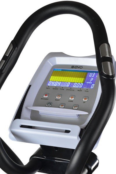 Компьютер с LCD дисплеем прост в управлении, и отображает все основные параметры тренировки – время, пройденную дистанцию, скорость, уровень нагрузки, расход калорий, обороты в минуту и пульс. В поручни вмонтированы сенсорные датчики съема пульса. В программный пакет входит 21 программа, что позволяет пользователю достичь любого желаемого результата. Спецификация программ: 12 тренировочных программ, 4 пользовательские программы, 4 пульсозависимые программы, ватт-программа. Нагрузка имеет 16 уровней сопротивления и регулируется электронным путем.