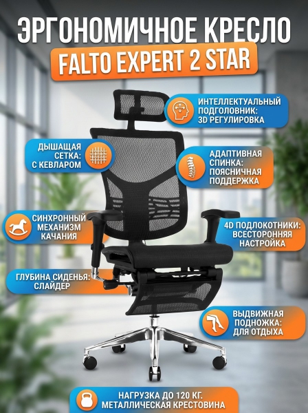 Кресло эргономичное Falto Expert 2 Star с подножкой - ОписаниеСомневаетесь? - Посмотрите рейтинг ТОП-10 по категории «Ортопедические кресла»Функциональное кресло серии Expert настраивается просто и естественно на все анатомические параметры пользователя и благодаря качественному механизму поддерживает человека в любом принимаемом положении, максимально разгружая позвоночник.
