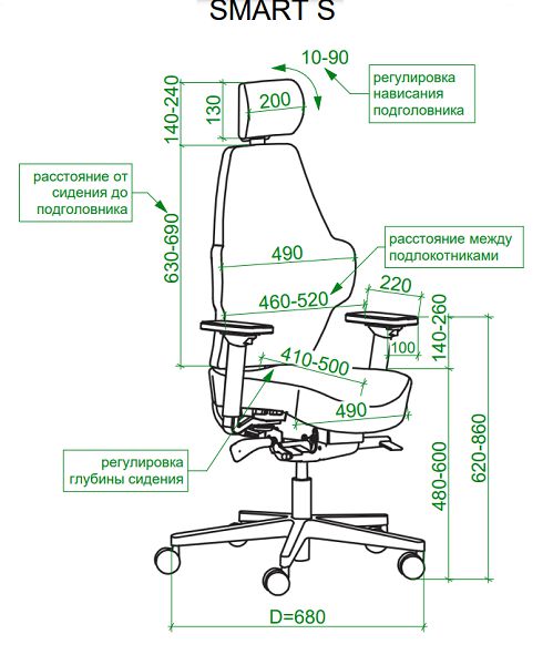 Высокая спинка оригинального дизайна с зауженной верхней частью для свободного движения в плечевой зоне и свободного раскрытия грудной клетки. Удобная настройка по высоте без кнопок и рычагов, в диапазоне 60 мм, 5 точек фиксации. Выделена поясничная зона. Особенностью модели кресла SMART-S является оригинальная спинка с большим объёмом боковой поддержки. Подобная ортопедическая конструкция управляет осанкой пользователя. Верхняя часть спинки состоит из плотного наполнителя, удерживающего правильное положение в грудном отделе позвоночника.