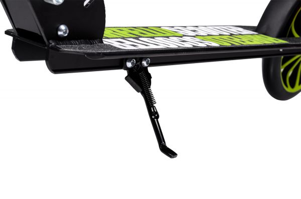 Для контроля над ездой и быстрой остановки, в конструкции предусмотрен ножной тормоз, который не нагревается и также является задним крылом. Стоит отметить наличие удобной выдвигающейся подножки, которая оставляет стоять самокат неподвижно на месте в разложенном состоянии.