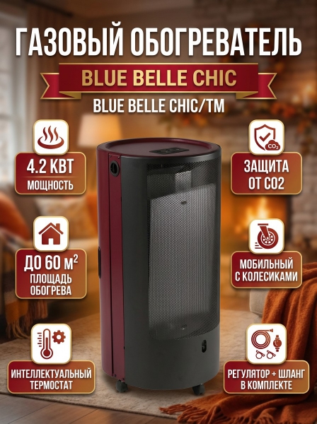 Газовый обогреватель каминного типа TMC BLUE BELLE CHIC/TM - ОписаниеГазовый обогреватель Blue Belle Chic каминного типа имеет современный дизайн и легко впишется в любой, даже самый изысканный интерьер вашего дома. В обогревателе баллон размещён в специальном отделении с дверцей, благодаря чему обогреватель смотрится стильно и гармонично. Мобильность устройству придаёт наличие роликов, которые обеспечивают удобное размещение в интерьере. Обогреватель оснащен моделирующим термостатом, который поддерживает постоянную температуру в комнате. Термостат автоматически уменьшает пламя горелки, если в комнате была достигнута заданная температура. При понижении температуры воздуха — пламя увеличивается.