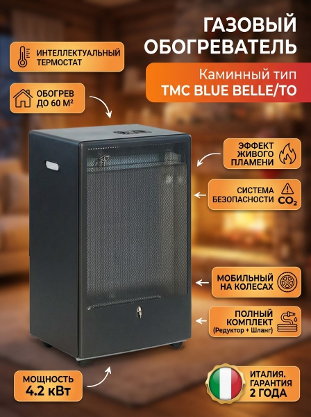 Газовый обогреватель каминного типа TMC BLUE BELLE/TO - ОписаниеГазовый обогреватель Blue Belle каминного типа имеет современный дизайн и легко впишется в любой, даже самый изысканный интерьер вашего дома. Мобильность устройству придаёт наличие роликов, которые обеспечивают удобное размещение в интерьере. Обогреватель оборудован термостатом ON/OFF. Пламя горелки автоматически гаснет при достижении необходимой температуры в помещении и снова загорается при снижении температуры. Эта функция, помимо оптимизации расхода топлива, экономит кислород в помещении.