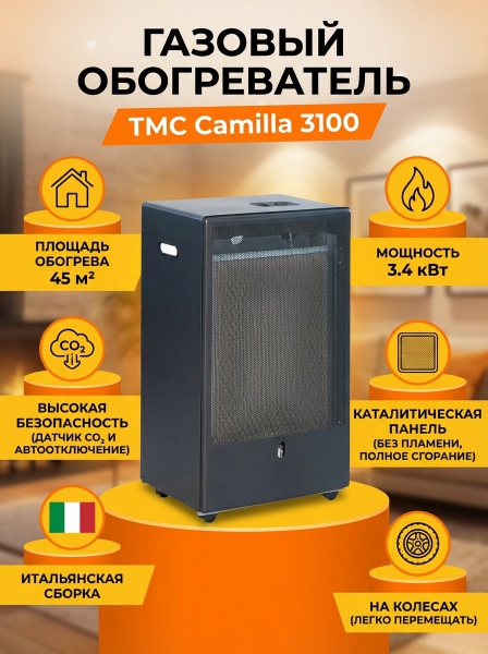 Газовый обогреватель TMC Camilla 3100 - ОписаниеГазовый обогреватель Camilla 3100 - это устройство, которое выделяет тепло за счет окисления. Оборудован каталитической панелью, идеально подходит для отопления сухих и чистых помещений. Перед упаковкой он тестируется на специальном стенде, что обеспечивает максимальную безопасность при использовании.