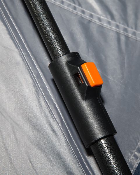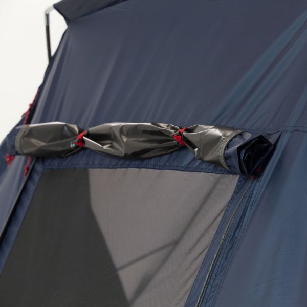 Благодаря особому механизму раскладка каркаса происходит автоматически. Недостаток такого решения – сложность ремонта в полевых условиях в случае повреждения хотя бы одной стойки или опоры. Спальные зоны устанавливаются внутри на подвесы по принципу «палатка-в-палатке» - так же не самый удачный вариант. Из-за особенностей конструкции и кроя основного тента, из жилых зон нет индивидуальных выходов (проход только через общий тамбур). Это самая большая кемпинговая палатка с полуавтоматическим каркасом и двумя независимыми комнатами, способными вместить до 6 человек. Между ними огромный тамбур для общения дружной компании, а также здесь можно хранить вещи или оборудовать кухню.