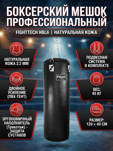 Мешок боксерский Fighttech HBL6 - ОписаниеСомневаетесь? - Посмотрите рейтинг ТОП-10 по категории «Боксерские мешки»Боксерский мешок Fighttech HBL6 из кожи.