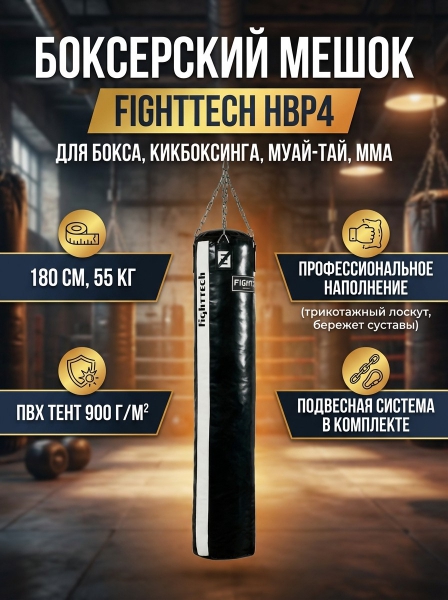 Мешок Fighttech HBP4 используется для занятий классическим и тайским боксом, а также подходит для других контактных единоборств, где необходима отработка ударов руками и ногами. Вес снаряда составляет 55 кг, что говорит о возможности использовать его для тренировки профессиональных спортсменов.