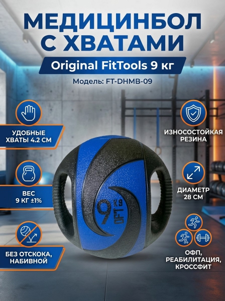 Медицинбол с хватами Original FitTools FT-DHMB-09 - ОписаниеМедицинбол или как его еще называют медбол - это мяч из прочно износостойкого материала, который набивается наполнителем с целью формирования формы и его утяжеления. Специальный мяч для занятия лечебной физкультурой. Мяч набивной, без отскока от поверхности. Обычно с ним делают разнообразные маховые движения и перебрасывают друг другу. В спорте используется при восстановлении подвижности суставов и тонуса мышц после травм, а также в различных имитационных движениях всевозможных бросков и толчков, в качестве дополнительного отягощения при занятиях ОФП.
