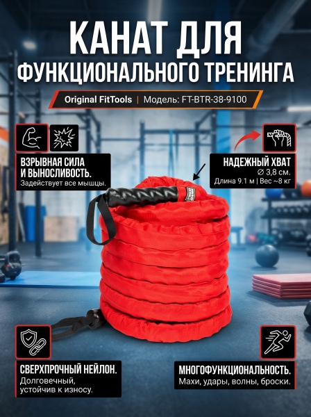Канат для функционального тренинга Original FitTools FT-BTR-38-9100 - ОписаниеКанат для функционального тренинга при всей своей простоте является очень эффективным средством для развития специфических качеств практически всех мышечных групп. Тренировка, которую можно провести на этом снаряде сочетает в себе силовую, скоростную и кардионагрузку. Такой канат, кроме спортсменов занимающихся кроссфитом, может быть весьма полезен в общефизической и специальной подготовке спортсменам других видов спорта: борцам, боксерам, тяжелоатлетам, баскетболистам, волейболистам и т.д. Материал изделия - нейлон.