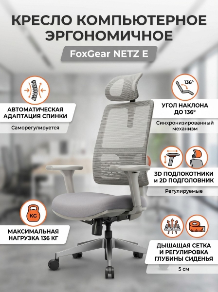 Кресло компьютерное эргономичное FoxGear NETZ модель E, серый - Преимущества