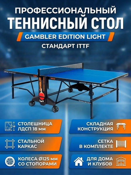Теннисный стол Gambler Edition light синий - ДоставкаДоставка по Москве: бесплатно, 1-2 дняДоставка по Санкт-Петербургу: бесплатно, 2-3 дня Доставка по России: стоимость уточняйте у оператора. Теннисный стол Gambler Edition light синий - Отзывы0.0