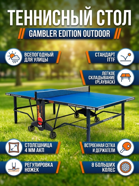Теннисный стол Gambler Edition Outdoor blue - ДоставкаДоставка по Москве: бесплатно, 1-2 дняДоставка по Санкт-Петербургу: бесплатно, 2-3 дня Доставка по России: стоимость уточняйте у оператора. Теннисный стол Gambler Edition Outdoor blue - Отзывы0.0