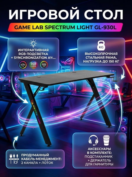 Стол компьютерный GameLab Spectrum Light Black - ОписаниеСомневаетесь? - Посмотрите рейтинг ТОП-10 по категории «Геймерские столы»Для максимального погружения в игровую атмосферу GameLab SPECTRUM оборудован двумя зонами подсветки с разнообразными RGB эффектами, которые легко переключаются с помощью пульта дистанционного управления. Также в столе GameLab SPECTRUM реализована 5V синхронизация с подсветками Asus Aura Sync, Gigabyte RGB Fusion, MSI Mystic Light Sync и ASRock Polychrome Sync, что позволяет придать единый стиль всей игровой системе.