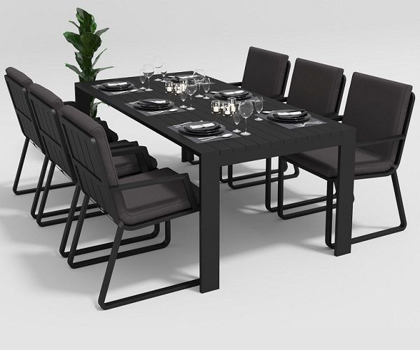 Обеденная группа Gardenini Malia 1426078045 - ОписаниеКомфортная обеденная группа MALIA – погружение в мир уюта и душевного отдыха. Удобные спинки, мягкие подушки сидений стульев, обеденный стол с широкими алюминиевыми планками на столешнице придадут поистине домашнюю обстановку любому пространству: зоне патио, террасе или беседке на заднем дворике. Каркас мебели выполнен из всесезонного алюминия с порошковым покрытием темно-серого цвета (карбон). Подушки спинок и сидений стульев обшиты уличной тканью темно-серого цвета (А13805) с водоотталкивающей пропиткой, толщина подушек 5 см. Столешница обеденного стола изготовлена из алюминивых планок шириной 7 см.