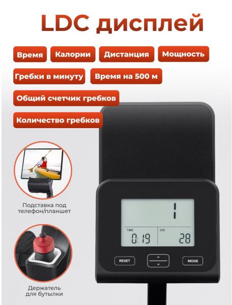 Гребной тренажер DFC ECHANFIT CRW4107A-N - ОписаниеСомневаетесь? - Посмотрите рейтинг ТОП-10 по категории «Гребные тренажеры»Гребной складной тренажер DFC ECHANFIT CRW4107A-N — это удобный и функциональный тренажёр для домашнего использования с магнитной системой нагрузки. Он сочетает эффективность, комфорт и простоту эксплуатации, помогая поддерживать отличную физическую форму и тренировать всё тело. Модель рассчитана на пользователей весом до 120 кг. Удобное сиденье обеспечивает комфорт во время тренировки, позволяя сосредоточиться на выполнении упражнений. Слайд длиной 64,3 см обеспечивает естественную амплитуду движений и комфорт при каждом гребке. Эргономичная конструкция способствует правильному положению тела, снижая нагрузку на спину и суставы. В модели установлен Bluetooth для подключения к приложению с онлайн тренировками FITSHOW. Магнитная система с механической регулировкой предлагает 16 уровней нагрузки, позволяя легко адаптировать интенсивность тренировки под индивидуальные цели и уровень подготовки, а вес маховика 3 кг способствует плавной и стабильной работе тренажёра, создавая комфортные условия для длительных и эффективных тренировок. Тренажёр оснащён монохромным LCD-дисплеем, отображающим ключевые показатели тренировки — время, дистанция, ватт, калории, гребки в минуту, время на 500 м, количество гребков, общий счетчик гребков. Это помогает отслеживать прогресс и контролировать результативность занятий. В комплект входят две батарейки типа AAA, необходимые для работы дисплея. Этот гребной тренажер оснащен функцией Bluetooth, вы можете подключиться к FitShow и Kinomap через Bluetooth. Тренажёр складной, что позволяет компактно хранить его в сложенном виде, экономя пространство в квартире или доме. Компактные габариты в сложенном состоянии делают его удобным для хранения даже в небольших помещениях. Рифленые педали с регулируемыми ремешками обеспечивают надежную фиксацию ног. Также есть компенсаторы неровности пола, которые гарантируют стабильность тренажера, а транспортировочные ролики обеспечивают лёгкое и удобное перемещение, позволяя без труда менять его расположение в помещении. Гребной тренажер DFC ECHANFIT CRW4107A-N — компактный и удобный для домашних тренировок. Он оснащён подставкой под планшет и держателем для бутылки, что обеспечивает комфорт и удобство во время занятий. Плавное сопротивление и надёжная конструкция делают тренировку эффективной и безопасной.