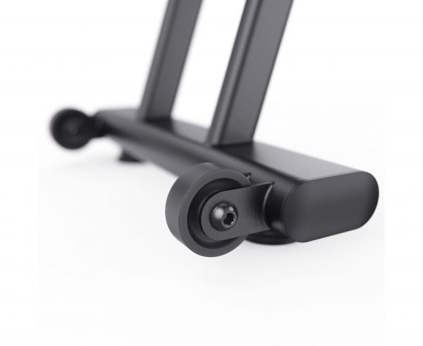 Увеличенные рифленые педали с регулируемыми ремешками обеспечивают надежную фиксацию ног, а подставка под планшет позволяет использовать устройства для удобства тренировки. Прочная направляющая обеспечивает плавное и стабильное движение, подходящее для пользователей ростом до 190 см. Регулируемый держатель снижает нагрузку на шею, также есть компенсаторы неровности пола, которые гарантируют стабильность тренажера, а транспортировочные колеса позволяют легко перемещать тренажер по помещению.