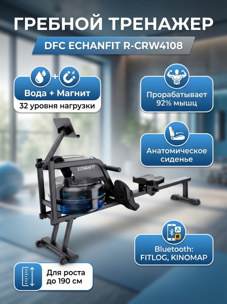 Гребной тренажер для дома DFC ECHANFIT R-CRW4108 - ОписаниеСомневаетесь? - Посмотрите рейтинг ТОП-10 по категории «Домашние гребные тренажеры»Гребной тренажер ECHANFIT R-CRW4108 — это надежный и удобный тренажер для домашних тренировок, оснащенный водно-магнитный системой нагрузки и функцией Bluetooth. Он сочетает эффективность, комфорт и современные технологии, помогая достигать высоких результатов и тренироваться с максимальным удовольствием.