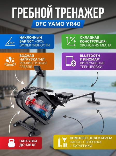 Гребной тренажер для дома DFC YAMO YR40 - ОписаниеСомневаетесь? - Посмотрите рейтинг ТОП-10 по категории «Домашние гребные тренажеры»Гребной тренажер YAMO YR40 с наклонным баком – это отличное решение для тех, кто хочет тренироваться дома и достигать высоких результатов. Подходит для пользователей разного уровня подготовки, благодаря универсальной настройке и удобству использования.