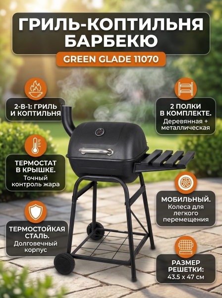 Гриль-барбекю Green Glade 11070 - ОписаниеГриль Green Glade 11070 – это замечательное решение для отдыха на природе в кругу семьи или друзей. Благодаря наличию полочек можно удобно расположить все вспомогательные элементы и продукты для приготовления еды. Данная модель имеет два колеса для передвижения конструкции с места на место. На крышке есть термостат, который помогает контролировать температуру приготовления блюда. Гриль можно использовать в качестве коптильни, для которой не требуется никакого дополнительного оборудования.