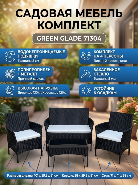 Комплект садовой мебели Green Glade 71304 - ДоставкаДоставка по Москве: бесплатно, 1-2 дняДоставка по Санкт-Петербургу: бесплатно, 2-3 дня Доставка по России: стоимость уточняйте у оператора. Комплект садовой мебели Green Glade 71304 - Отзывы0.0