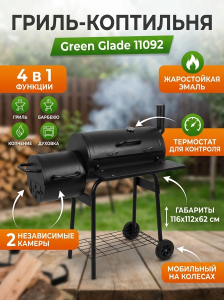 Гриль-барбекю Green Glade 11092 - ОписаниеГриль-коптильня или смокер – это устройство, состоящее из двух цилиндров, соединенных друг с другом. В гриль-коптильне можно готовить гриль, барбекю, шашлык, коптить и запекать. Это универсальный и незаменимый инструмент для приготовления пищи на огне для загородного дома.