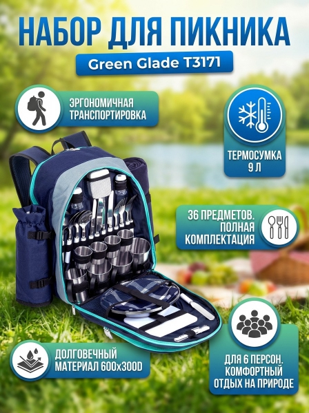 Набор для пикника Green Glade Т3171 (36 предметов) - ОписаниеНабор для пикника Green Glade T3171 является незаменимой вещью для отдыха на природе и в дальних поездках. Набор для пикника на 6 персон включает 36 предметов. Приборы упакованы в удобную сумку с термоотделением для продуктов объмом 9 литров.