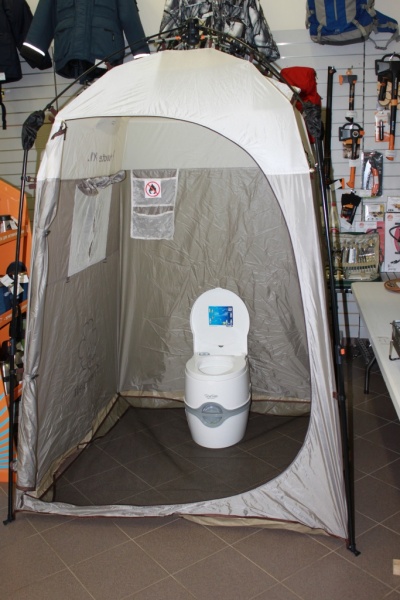 Тент с полуавтоматическим каркасом и телескопическами дугами. Не требует большой площадки для установки. Можно использоваться как полноценный душ, туалет и место для хранения. Также применяется в качестве судейского места, наблюдательного пункта, как укрытие от дождя для стоящего или сидящего человека. Удобно при проведений акций или мероприятий на природе. Окошко с сеткой. Крепление для переносного душа. Один вход. Перекладина для полотенца.