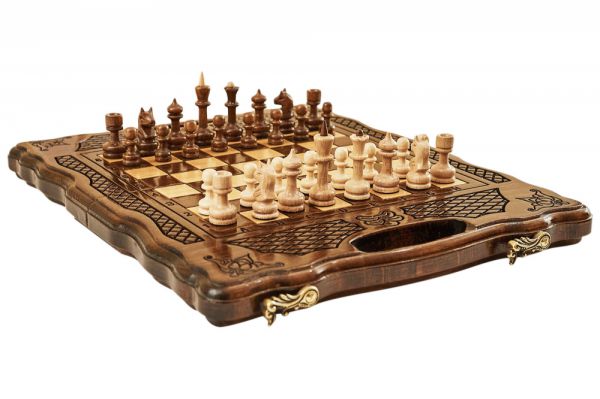 Шахматы + нарды резные Haleyan kh139-3 - ОписаниеАвтором этого удивительного комплекта является известный армянский мастер. Доска, сделанная из буковой древесины, имеет интереснейший резной орнамент, поражающий своей детализацией. Каждый элемент дополняет предыдущий, сливаясь в единую композицию. Фигуры и фишки сделаны в классическом стиле. Каждая из них имеет подложку, которая нужна, чтобы защитить доску от механических повреждений. Кроме того, сама доска сверху покрыта декоративным лаком и скреплена надежной бронзовой фурнитурой.