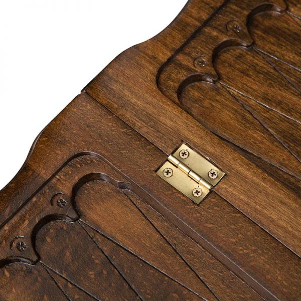 Нарды резные с ручкой Haleyan kh026-5 «Корабль» - ОписаниеМастер Карен Халеян порадовал всех любителей настольных игр очередной красотой под названием нарды резные "Корабль". Для того чтобы доска прослужила как можно более долгое время, её вырезали из прочной и упругой древесины, которая не деформируется при случайных падениях или ударах. К тому же, она обладает красивой, несимметричной фактурой, что придает изделию уникальности. Две створки скреплены между собой при помощи петель из бронзы, а при закрывании удерживаются двумя крючками аналогичного материала, которые точно не сломаются даже после тысячи открываний. На второй стороне имеется разлинованное поле, аналогично шахматной доске. При желании, фишками из комплекта, можно сыграть в обычные простые шашки, а если имеются шахматные фигурки, то и в них. Это очень удобно, ведь получается – одна доска позволяет играть в три разные игры и каждый подберет себе подходящую. Когда захотите куда-нибудь отправиться и взять нарды с собой, то обязательно упакуйте их в специальный чехол, который есть в комплекте.