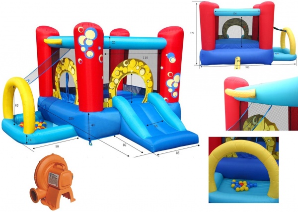 Надувной батут с горкой Happy Hop 9214 «Праздничные пузыри» - ОписаниеСомневаетесь? - Посмотрите рейтинг ТОП-10 по категории «Детские батуты»Красочный надувной аттракцион «Праздничные Пузыри» от компании «Хэппи Батут» станет отличным сюрпризом вашему малышу! Каждый ребенок любит ходить в парк развлечений, но если нет такой возможности, установите ему аттракцион прямо во дворе дома! Конструкция собирается за считанные минуты, при этом она абсолютно безопасна и очень полезна для каждого ребенка. Активно играя на свежем воздухе, ребята развиваются физически, они могут купаться в разноцветных шариках, бросать мяч, спускаться с горки и без устали прыгать.