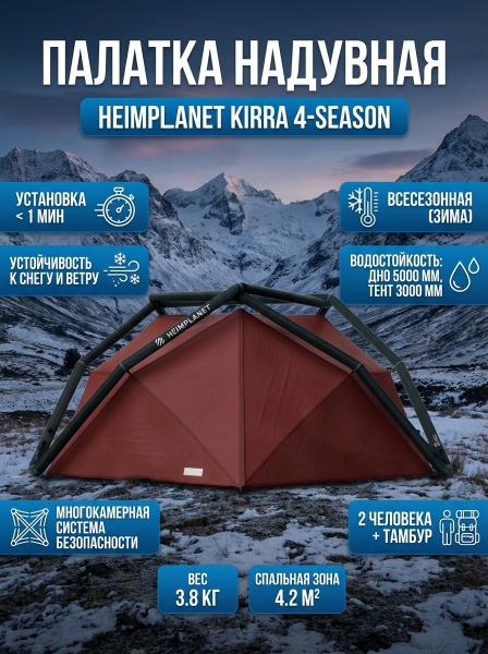 Палатка надувная для кемпинга HEIMPLANET KIRRA 4-season - ОписаниеHEIMPLANET HEIMPLANET KIRRA 4-season — это новая надувная палатка для кемпинга, предназначенная на 2 человека и большого количества снаряжения. Палатка HEIMPLANET KIRRA 4-season предназначена для круглогодичного использования. Благодаря геодезической геометрии палатка HEIMPLANET KIRRA 4-season останется устойчивой даже при самом сильном ветре, который бывает в горах или, например в тундре. Палатка KIRRA 4-season рассчитана на размещение 2 человек и большого количества снаряжения в отсеке между наружным тентом и внутренней частью палатки. Дышащие многослойные материалы защитят от мороза и сохранят циркуляцию воздуха, что позволит вам комфортно отдохнуть после тяжелого перехода. А устанавливается палатка буквально за 1 минуту, нужно лишь надуть дуги и закрепить пол палатки. Если вы внимательны к деталям, цените комфорт и технологичность, палатка HEIMPLANET KIRRA 4-season ваш выбор.