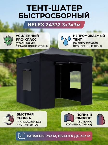 Тент-шатер быстросборный Helex 24332 3x3х3м полиэстер чёрный - БрендСтрана бренда: КНР Премиальность бренда:Тент-шатер быстросборный Helex 24332 3x3х3м полиэстер чёрный - Характеристики