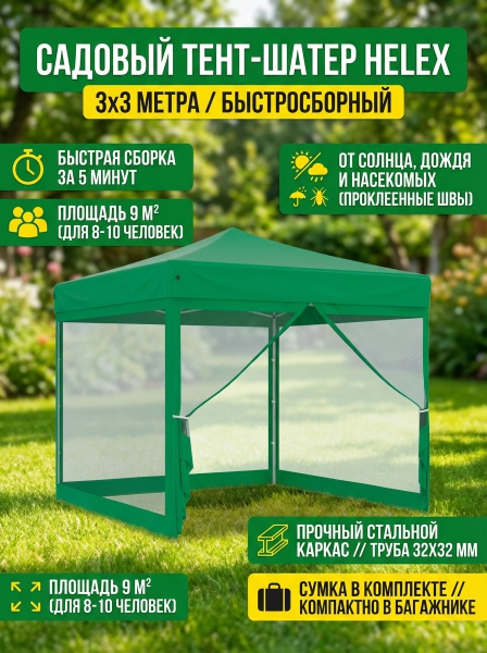 Тент садовый зеленый Helex 3x3х3м - ОписаниеСомневаетесь? - Посмотрите рейтинг ТОП-10 по категории «Шатры»Быстросборный садовый тент Helex 4351 – практичное и популярное решение для использования на пикниках, шашлыках и кемпинге, а также в качестве дачной беседки. Тент-шатер для сада прекрасно защищает от солнца. Он быстро раскладывается «гармошкой», его установка занимает считанные минуты. Не использовать при сильном ветре (свыше 10 м/с) и дожде. Предназначено для бытового использования