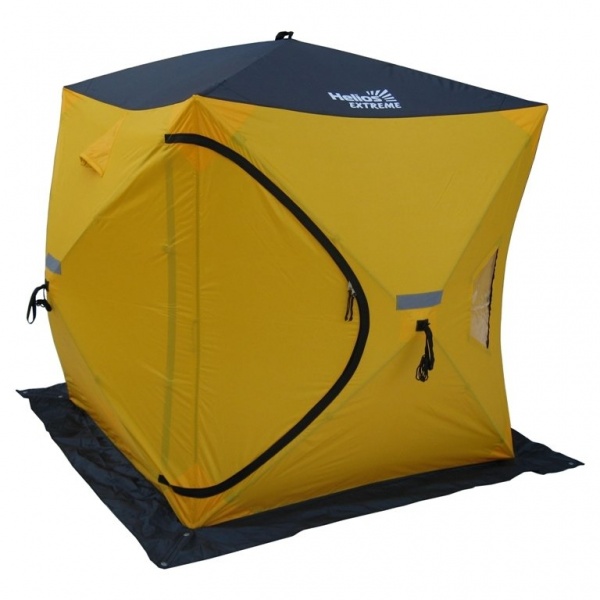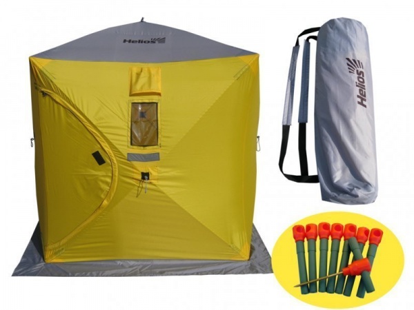 Палатка-куб для зимней рыбалки Helios Extreme - ОписаниеПалатка-куб зимняя EXTREME Helios (1.8 х 1.8) специально разработана для любителей подледной рыбалки. Быстросборная палатка-куб Helios EXTREME позволит рыболову чувствовать себя максимально комфортно на зимней рыбалке в любых погодных условиях. В собранном виде палатка имеет кубическую форму с выпуклыми наружу стенками, что способствует увеличению внутреннего объема и позволяет рыболовам стоять в полный рост. Прочный каркас палатки выполнен из фибергласса (диаметр дуги 0.95 см) и обеспечивает сохранение кубической формы даже при сильном ветре. Тент закреплен к каркасу палатки и дополнительно зафиксирован к дугам каркаса фиксаторами на липучке. Дуги каркаса зафиксированы в углах палатки в специальные карманы из прочной стропы. На концах дуг закреплены защитные пластиковые колпачки, которые предотвратят порыв ткани в зоне стыка крыши и стен палатки. Металлический узел соединения дуг каркаса в отличие от пластиковых выдерживает даже очень сильные морозы. Прочная водостойкая ткань тента (полиэстер 300D, PU 2000 мм) надежно защитит от ветра и атмосферных осадков. Проклеенные швы на крыше палатки препятствуют проникновению влаги в палатку. Тент палатки выполнен из желтой и серой ткани, которая позволяет пропускать дневной свет во внутрь палатки, благодаря чему можно ловить рыбу в дневное время без подсветки дополнительными осветительными приборами. Воздухообмен осуществляется через 2 больших двухслойных окна (прозрачные "стекла" и глухие шторки) на липучках. Окна расположены на таком уровне от пола палатки, что свет, проходящий через окно будет освещать зону рук рыбака, это сделает рыбалку более комфортной. С помощью светозащитной шторки, выполненной из ткани палатки, можно регулировать освещение в палатке и ее прогрев солнечными лучами, полностью или частично открывая шторку. Вход палатки застегивается на усиленную молнию с 2 бегунками. Защитный клапан защитит от проникновения снега и ветра в палатку. Система вентиляции состоит из 2 вентиляционных и 1 приточного клапана внизу палатки, которые обеспечат постоянное циркулирование воздуха, создадут комфортный микроклимат внутри палатки, а также не позволят "угореть" находящемуся в ней рыболову. Палатка складывается в прочную сумку-чехол с лямками, которую можно носить как рюкзак. Карман на молнии. Края чехла усилены специальными вставками для защиты от порыва.
